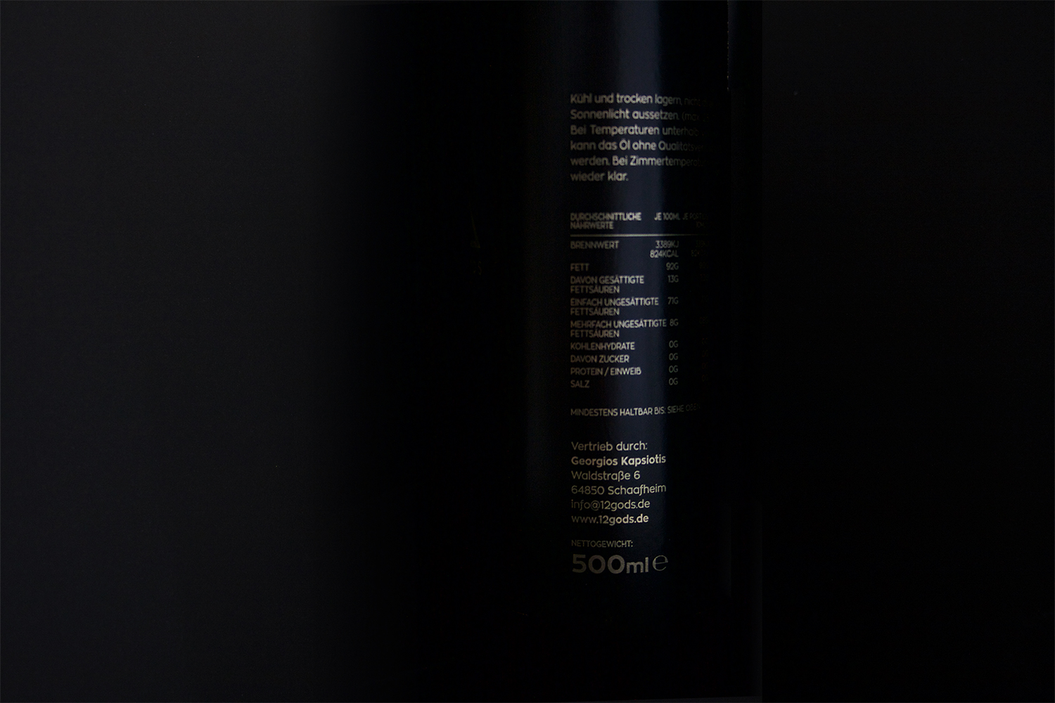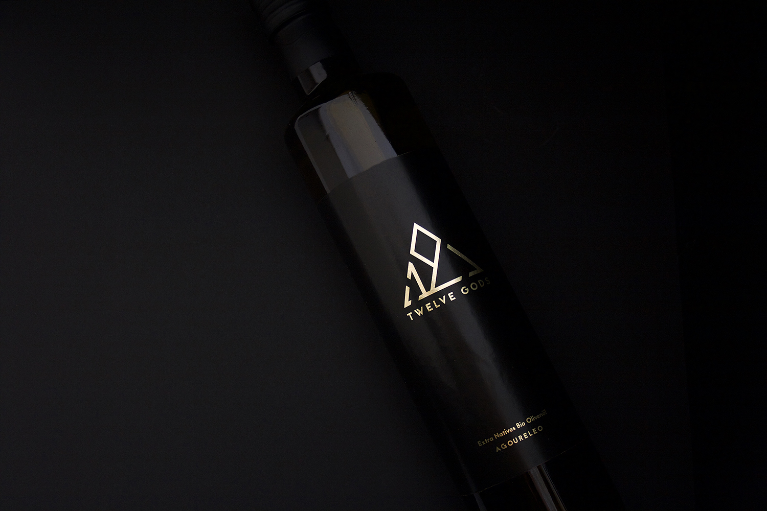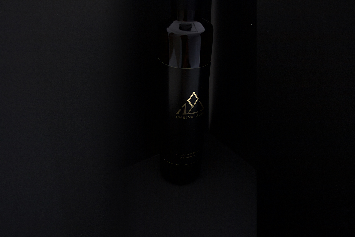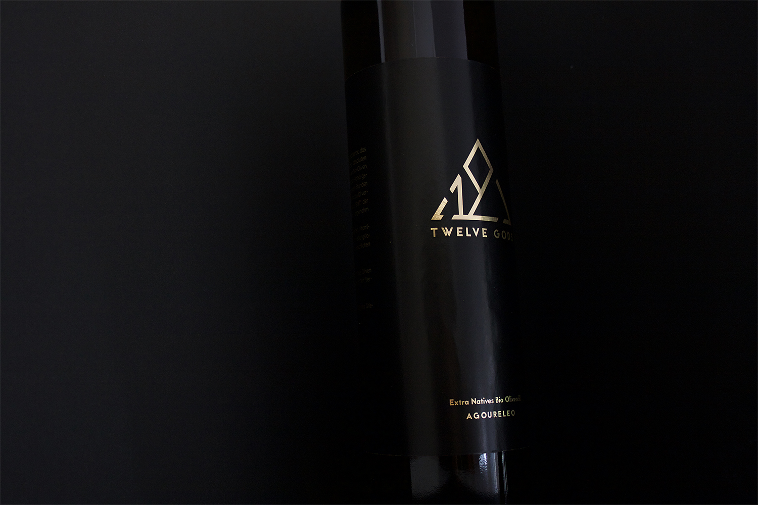 Σχεδιασμός λογοτύπου και συσκευασίας για το 12 Gods olive oil. Ένα αγουρέλαιο εξαιρετικής ποιότητας, περιβαλλόμενο από μια απόλυτα μαύρη ετικέτα με χρυσή τυπογραφία. Οι δώδεκα θεοί του Ολύμπου, από την ελληνική μυθολογία, αποτυπώνονται σε ένα λογότυπο με το αριθμητικο μέρος 12 να αποτελεί τμήμα το όρους Όλυμπος, όπου ειναι και το βασικό στοιχείο της ετικέτας.