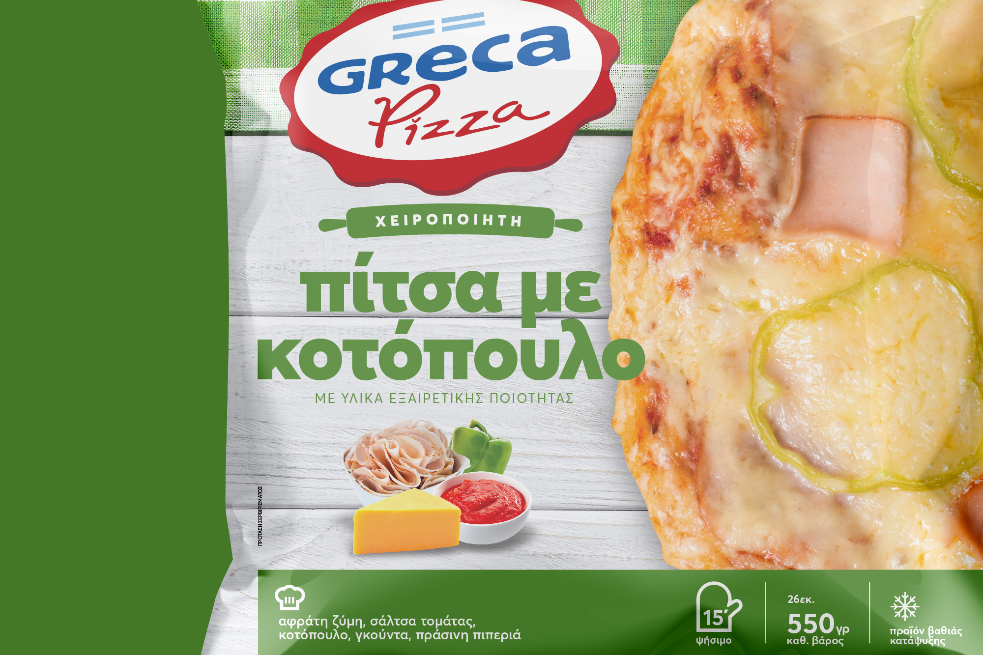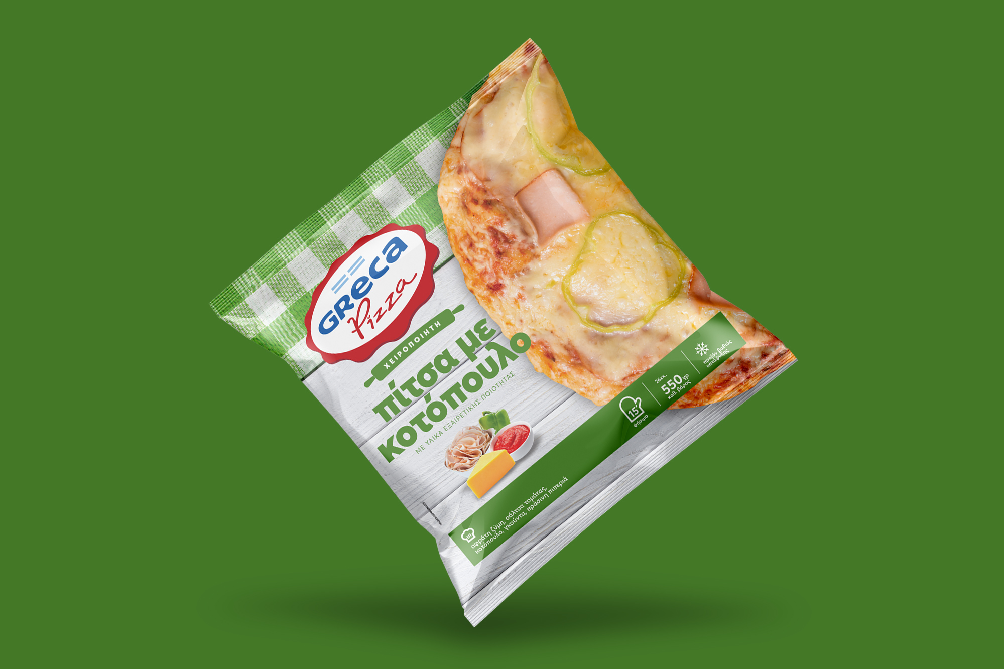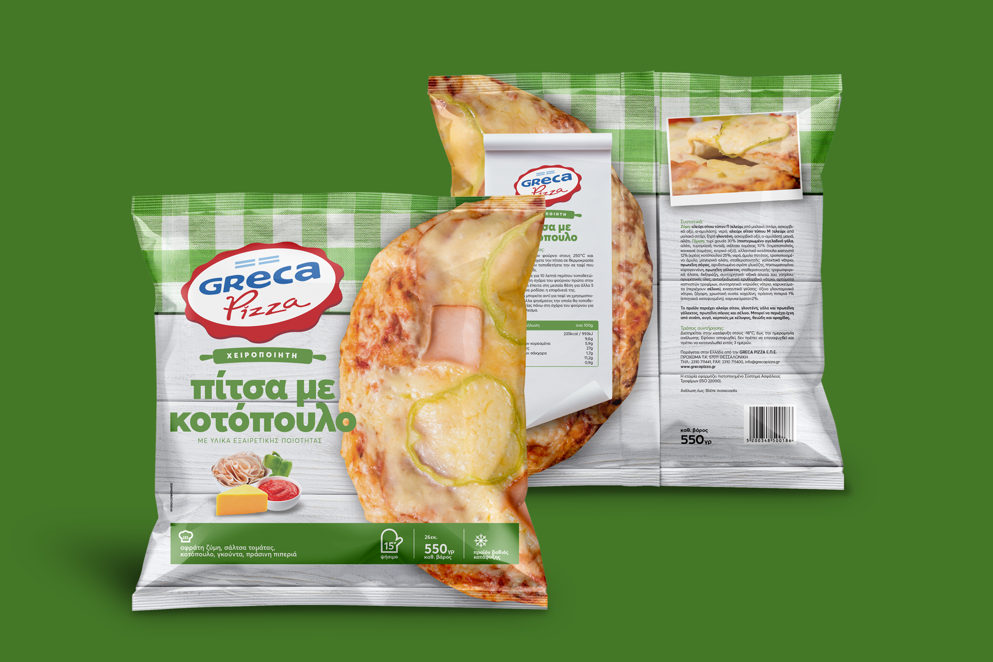 Σχεδιασμός εύκαμπτης συσκευασίας “Χειροποίητη Πίτσα με Κοτόπουλο” της εταιρίας GrecaPizza. Με χαρακτηριστικό σχεδιασμό, συνδυασμό του παραδοσιακού αλλά και του νεανικού στοιχείου, χρωματική κατηγοριοποίηση αλλά με κυρίαρχη τη λευκή παρουσία, σχεδιάστηκε μια εμπορική συσκευασία κατεψυγμένης πίτσας, που στοχεύει να κερδίσει την εμπιστοσύνη και βλέμμα του καταναλωτή.