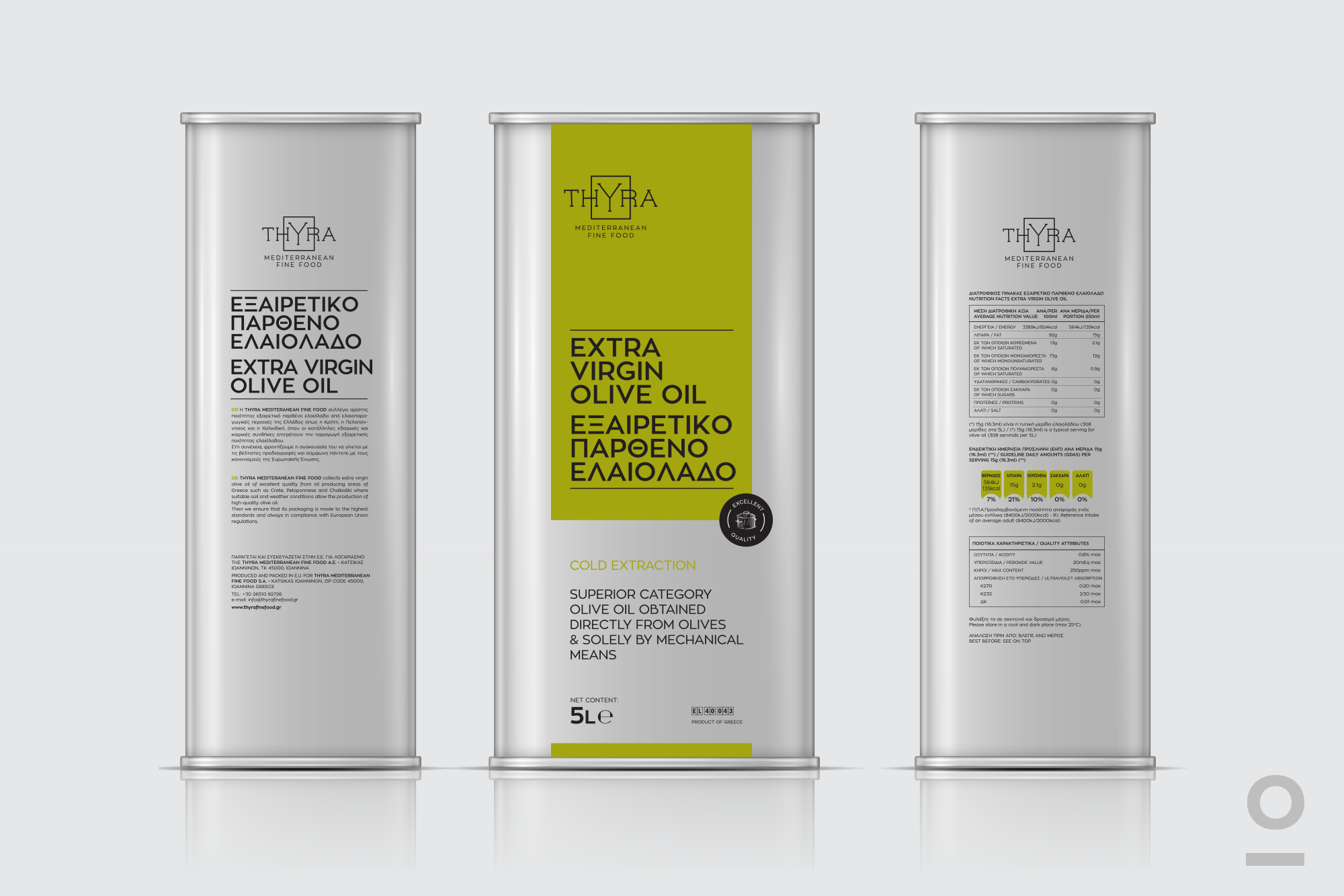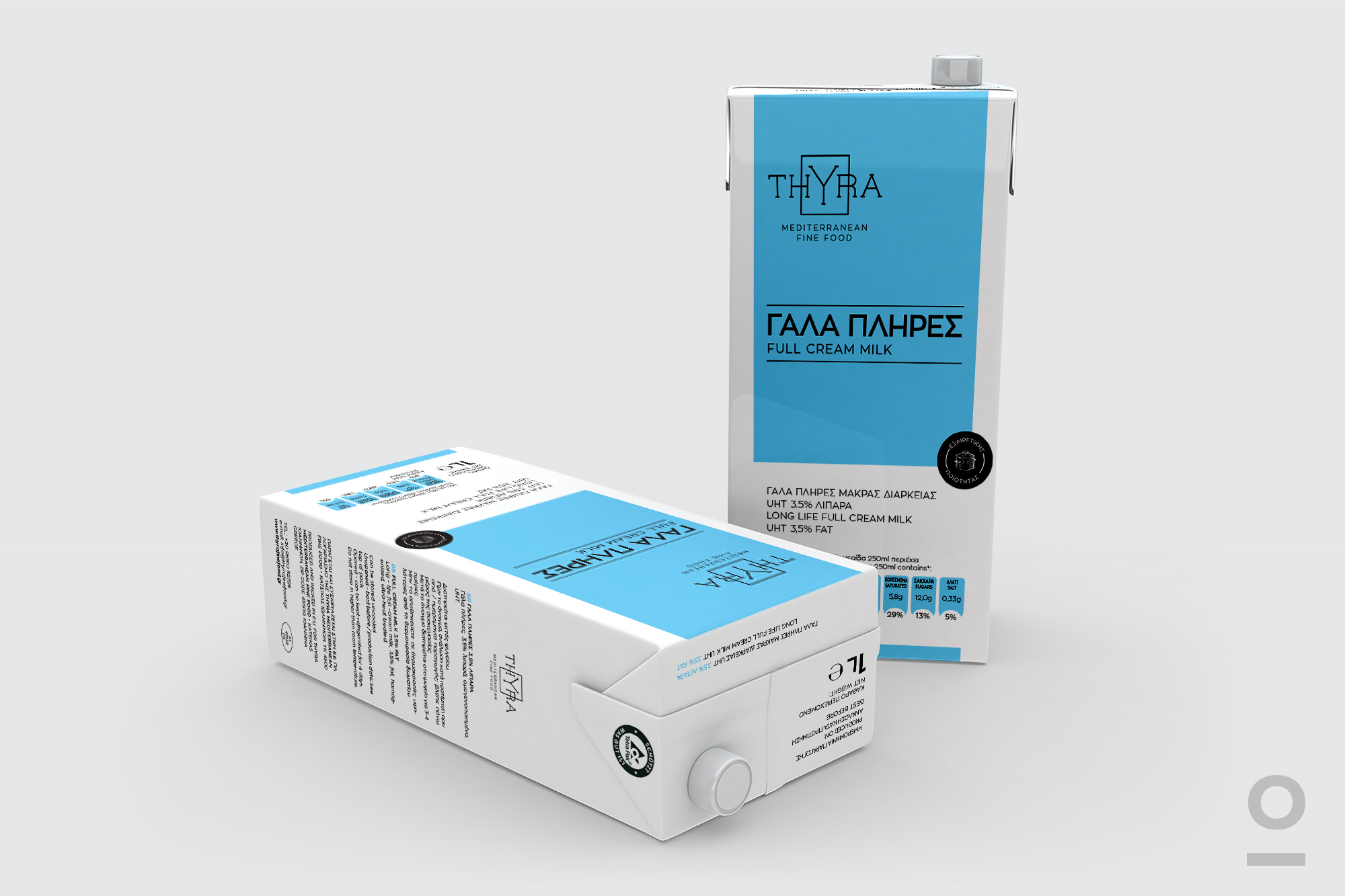 Logo and product identity design for the series retail & horeca Thyra | Mediterranean Fine Food. With a wide range of products and packaging such as long-life milk, fresh meat, olive oil, mayonnaise, can products and tomato products. We chose to use clean typography and colour classification for the proper product communication to the final consumer.
