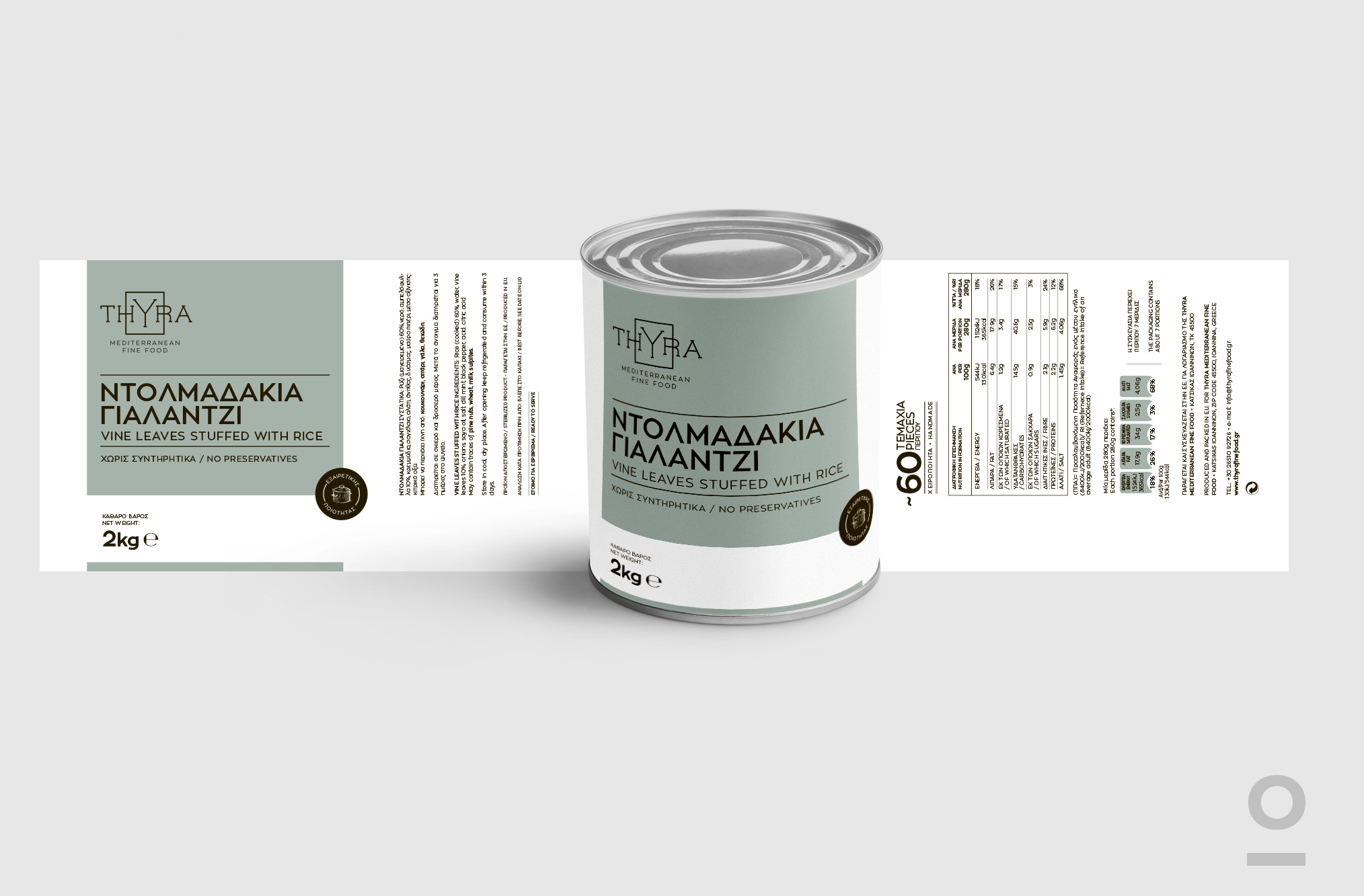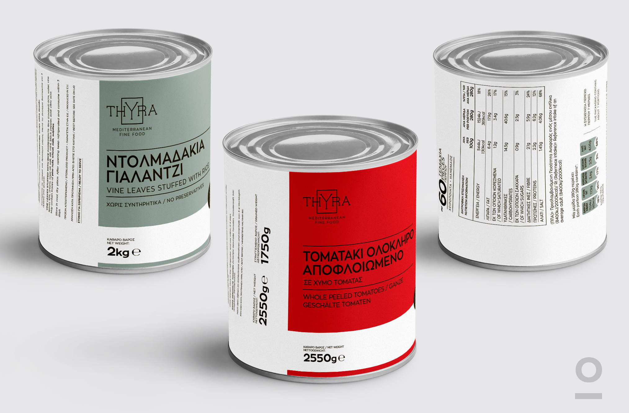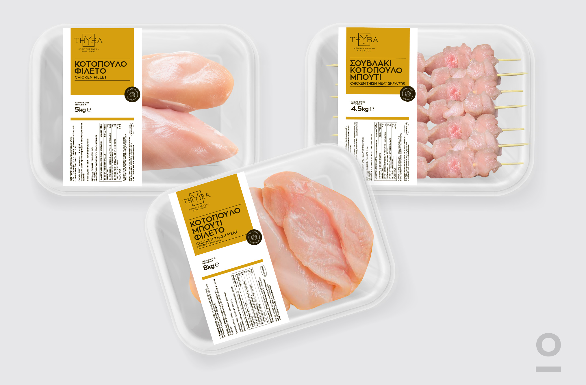 Σχεδιασμός λογοτύπου και προϊοντικής ταυτότητας για τη σειρά retail & horeca Thyra | Mediterranean Fine Food. Με ένα μεγάλο εύρος προϊόντων και συσκευασιών όπως γάλα μακράς διαρκείας, νωπό κρέας, ελαιόλαδο, μαγιονέζα, κονσέρβες και τοματοειδή. Επιλέξαμε την καθαρή χρήση τυπογραφίας και χρωματική κατηγοριοποίηση για την σωστή επικοινωνία του προϊόντος με τον τελικό καταναλωτή.